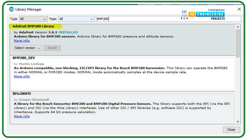 - Search for the Adafruit BMP280 library in Library Manager and click Install.
