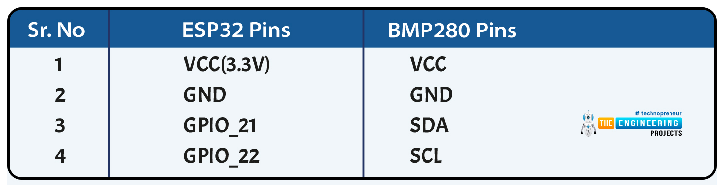 We are using the I2C protocol for interfacing the two (ESP and BMP280) so only SCL and SDA pins will be used with power pins for interfacing. The SDO and CSB pins will be used only if you are using the SPI protocol for interfacing.