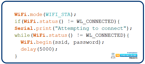 - Enable ESP32’s Wi-Fi module using begin() function which is using SSID and password as arguments.