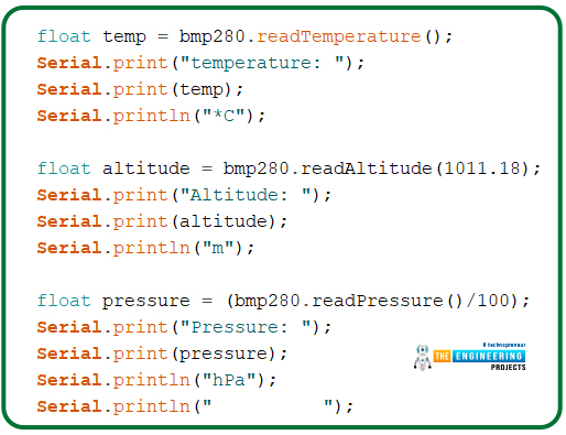 float pressure = (bmp280.readPressure()/100); //pressure measurement