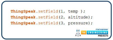 - Setting up the ThingSpeak fields for respective sensor measurement. The various sensor readings are passed as arguments inside the ThingSpeak.setField() function with there respective filed number.