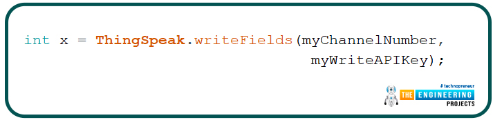 - writeFields() function is used to write data to the ThingSpeak server. This function is using the channel number and API key as an argument.